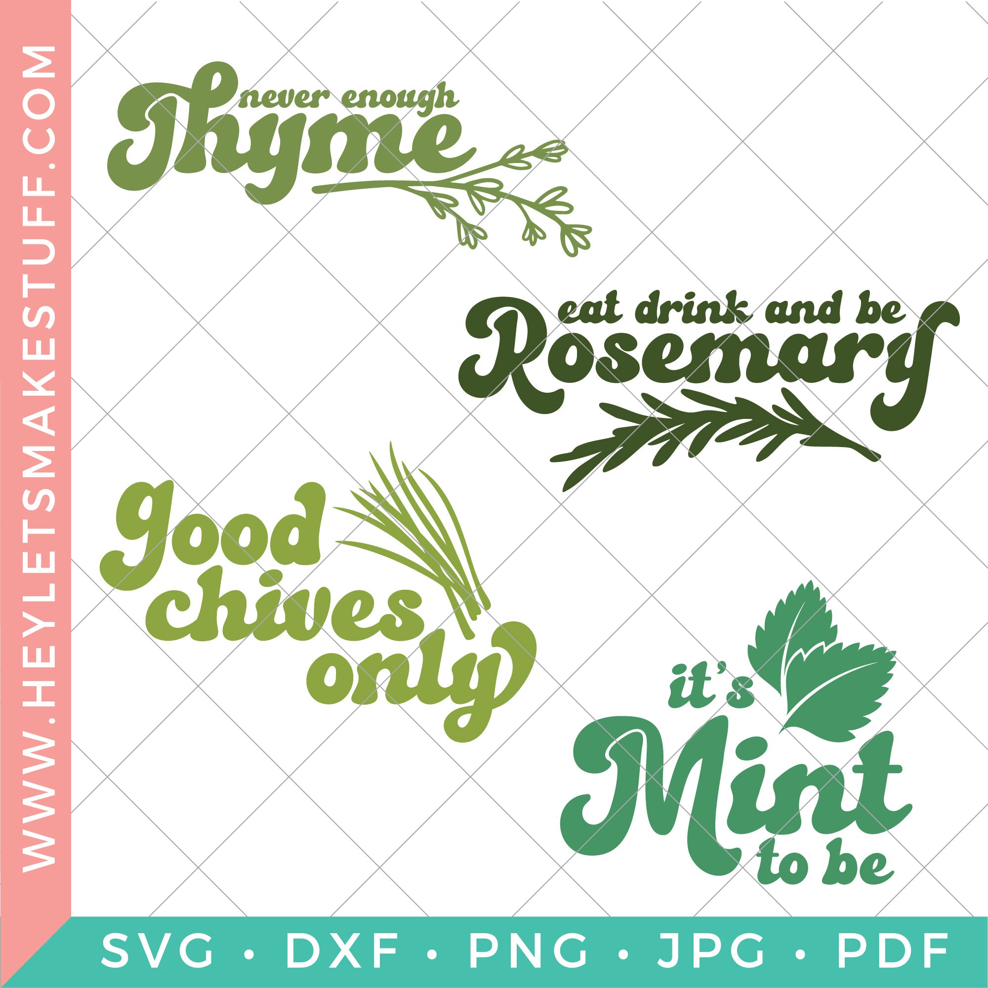 This playful herb pun bundle features fan favorites like Never Enough Thyme, Eat, Drink & Be Rosemary, Good Chives Only, and It’s Mint to Be. Perfect for creating pun-filled shirts, kitchen towels, totes, and gifts that are equal parts clever and cute!